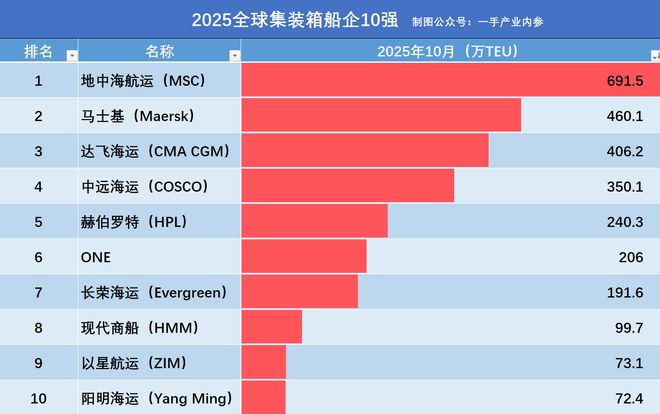 另附:2025年全球10大集装箱船运公司名单,数据源于:Alphaliner
